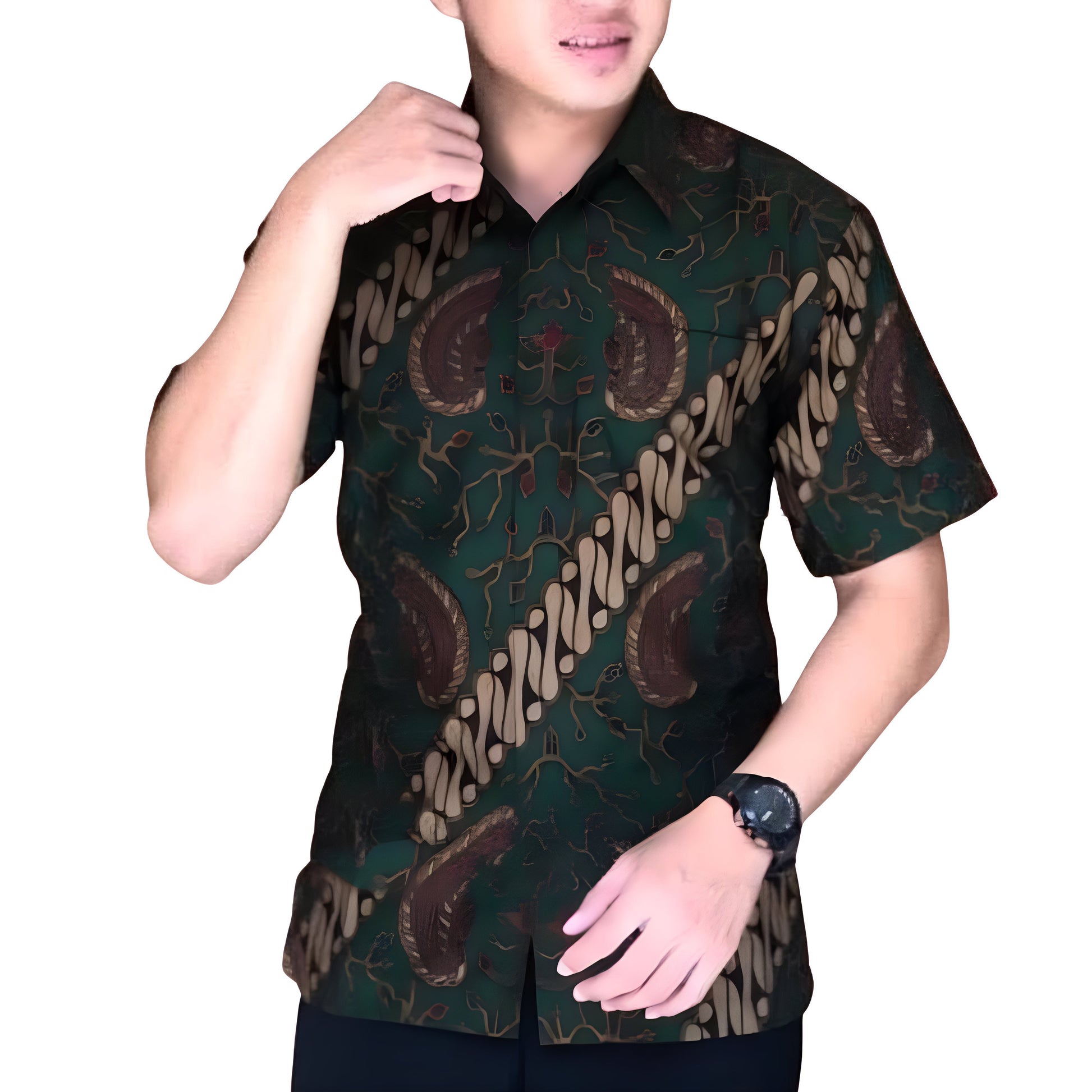 Men's Batik Shirt Dark Green Short Sleeve - Ajisaka